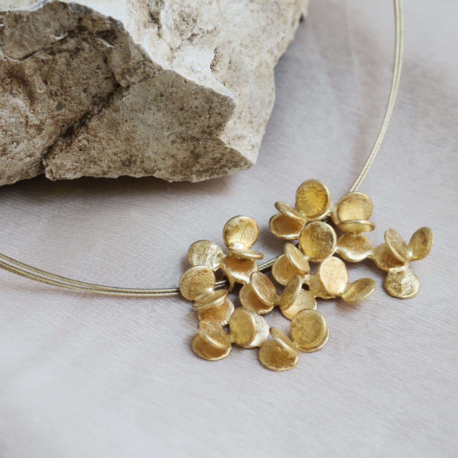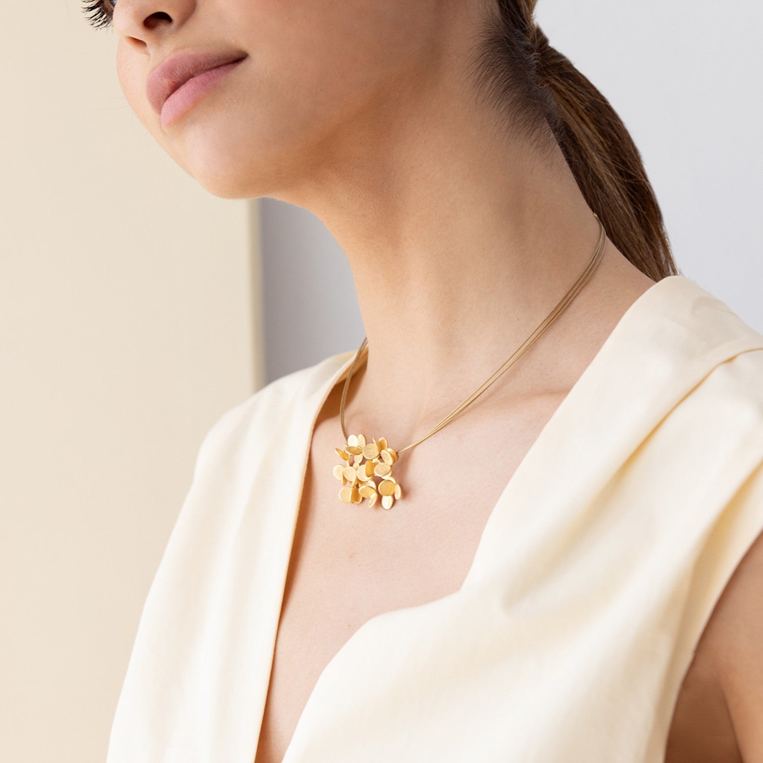 Halskette mit einem großen, mattierten Metallanhänger mit 24-karätiger Vergoldung, der durch die Aneinanderreihung kleiner Kreise entsteht, die zu Gruppen zusammengefasst sind und unterschiedliche Volumen bilden. Von Hand gekratzte Oberfläche mit glänzenden Enden.