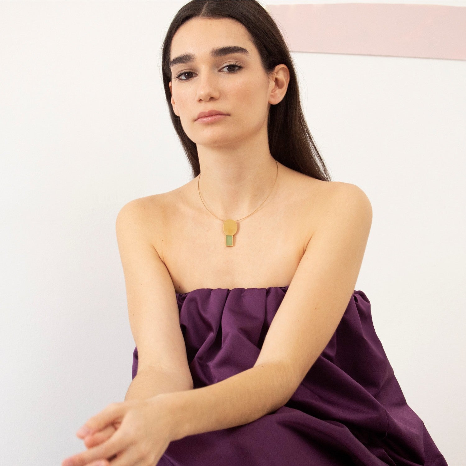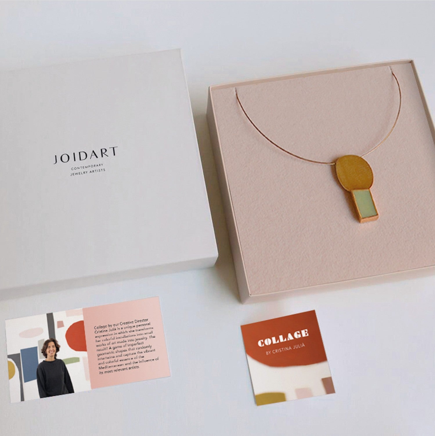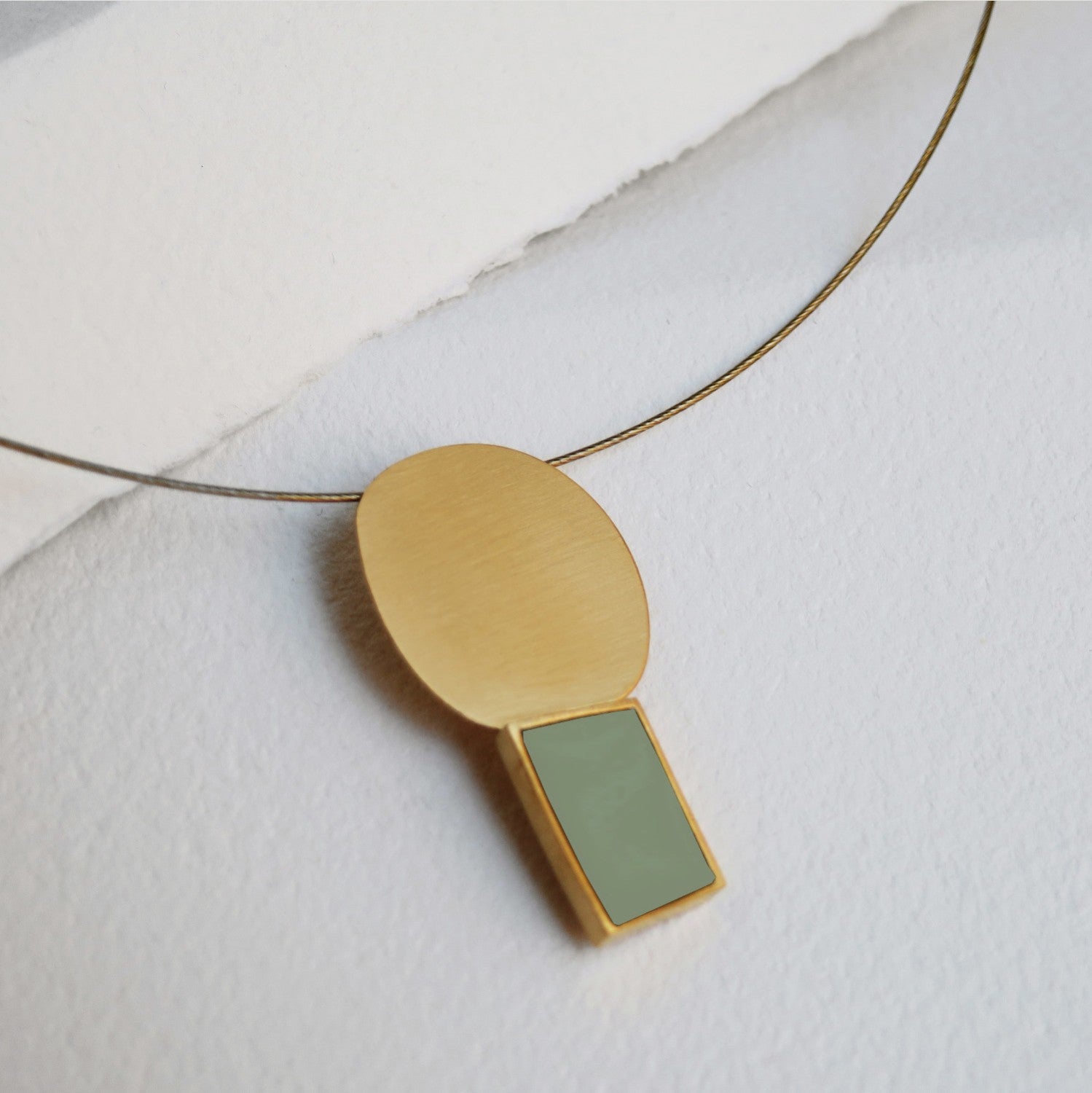 Halskette mit großem Anhänger mit zwei unvollkommenen geometrischen Formen, die zufällig miteinander kombiniert sind.