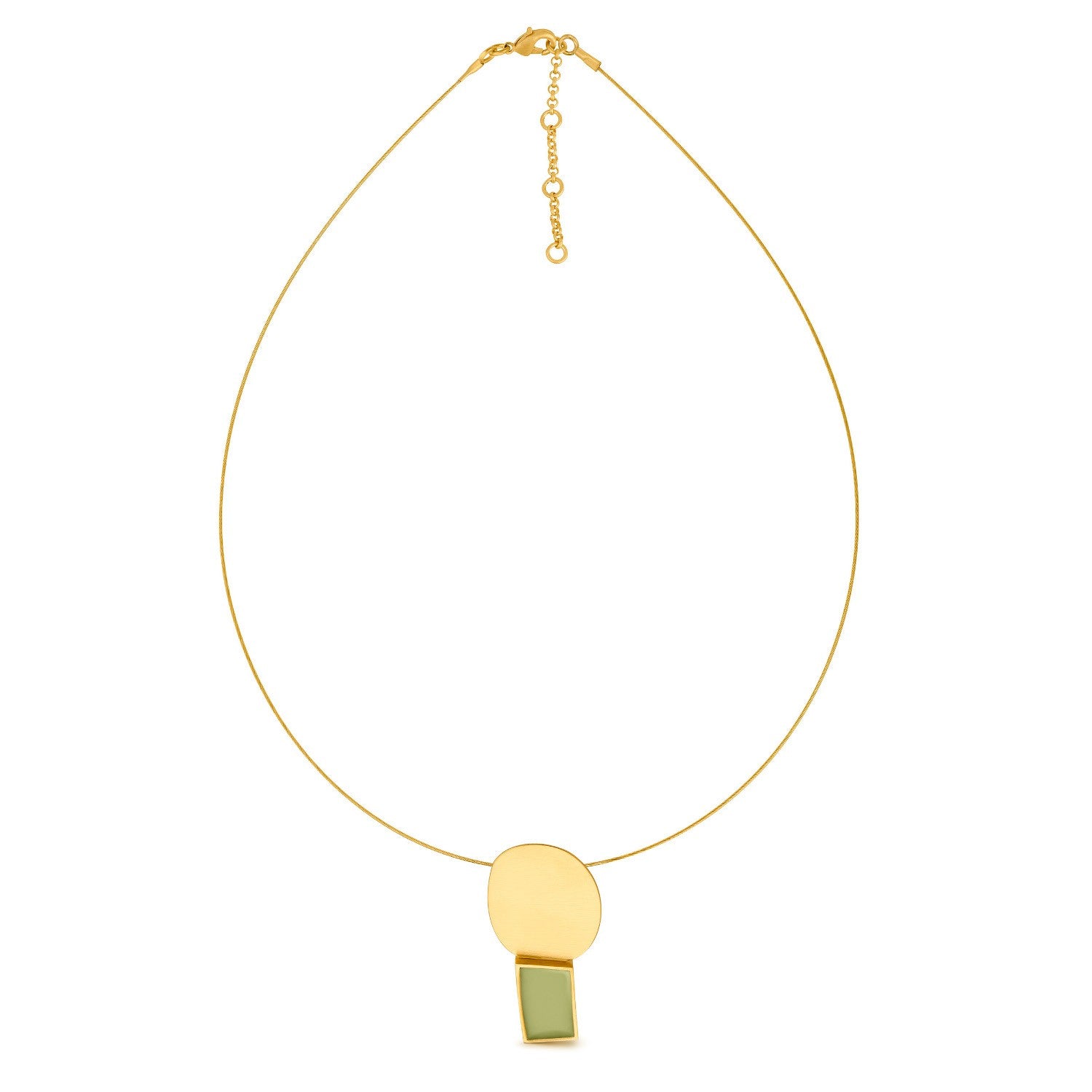 Das Schmuckstück besteht aus mattem Metall mit 24-karätiger Vergoldung und grüner Emaille. Stahlkabel und Karabinerverschluss mit Verlängerungskette.