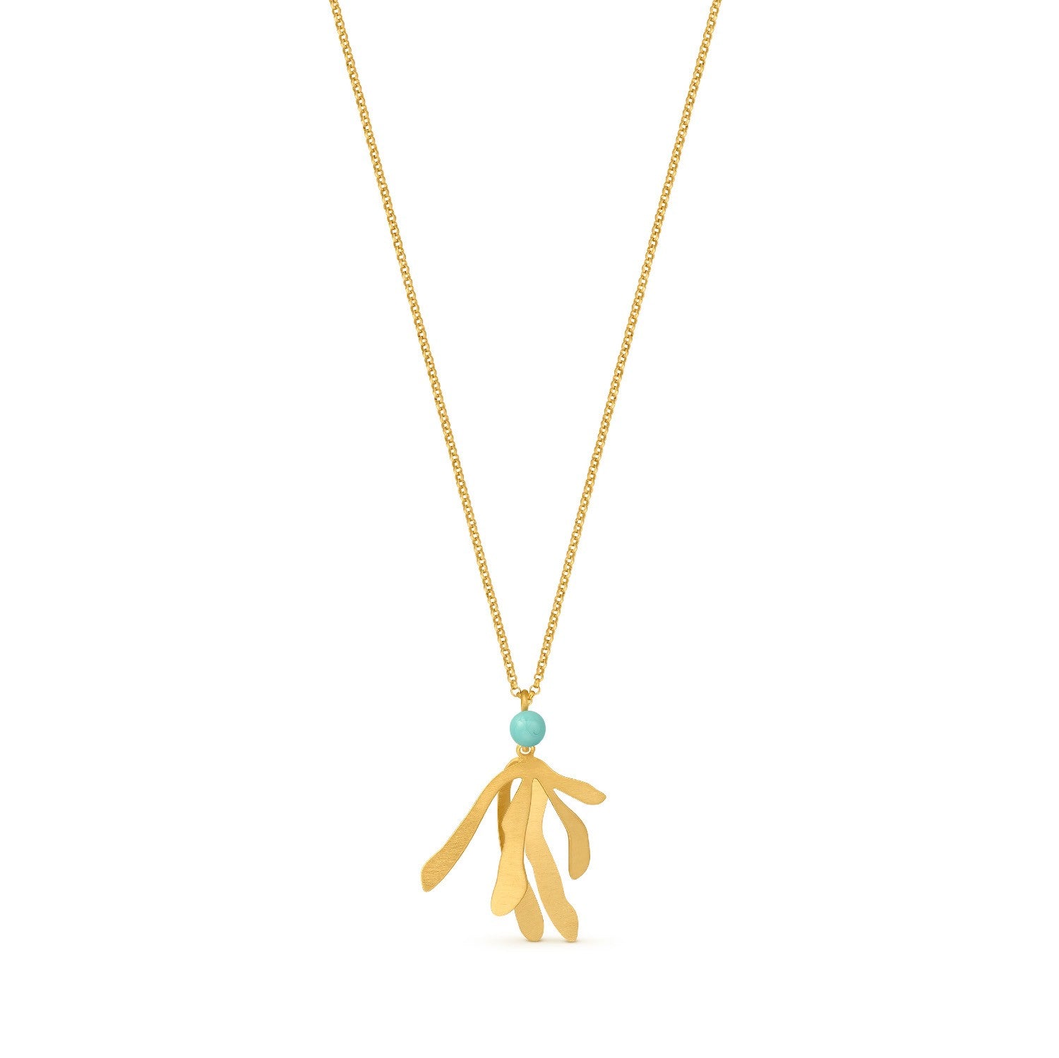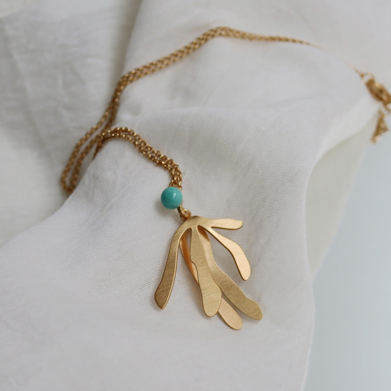 Halskette aus mattem Metall mit 24 Karat Vergoldung, mit einem Anhänger, der von der Silhouette der Blätter des mediterranen Feigenbaums inspiriert ist, und einer handgefertigten Murano-Glasperle in Türkisfarbe. Karabinerverschluss und Verlängerungskette.
