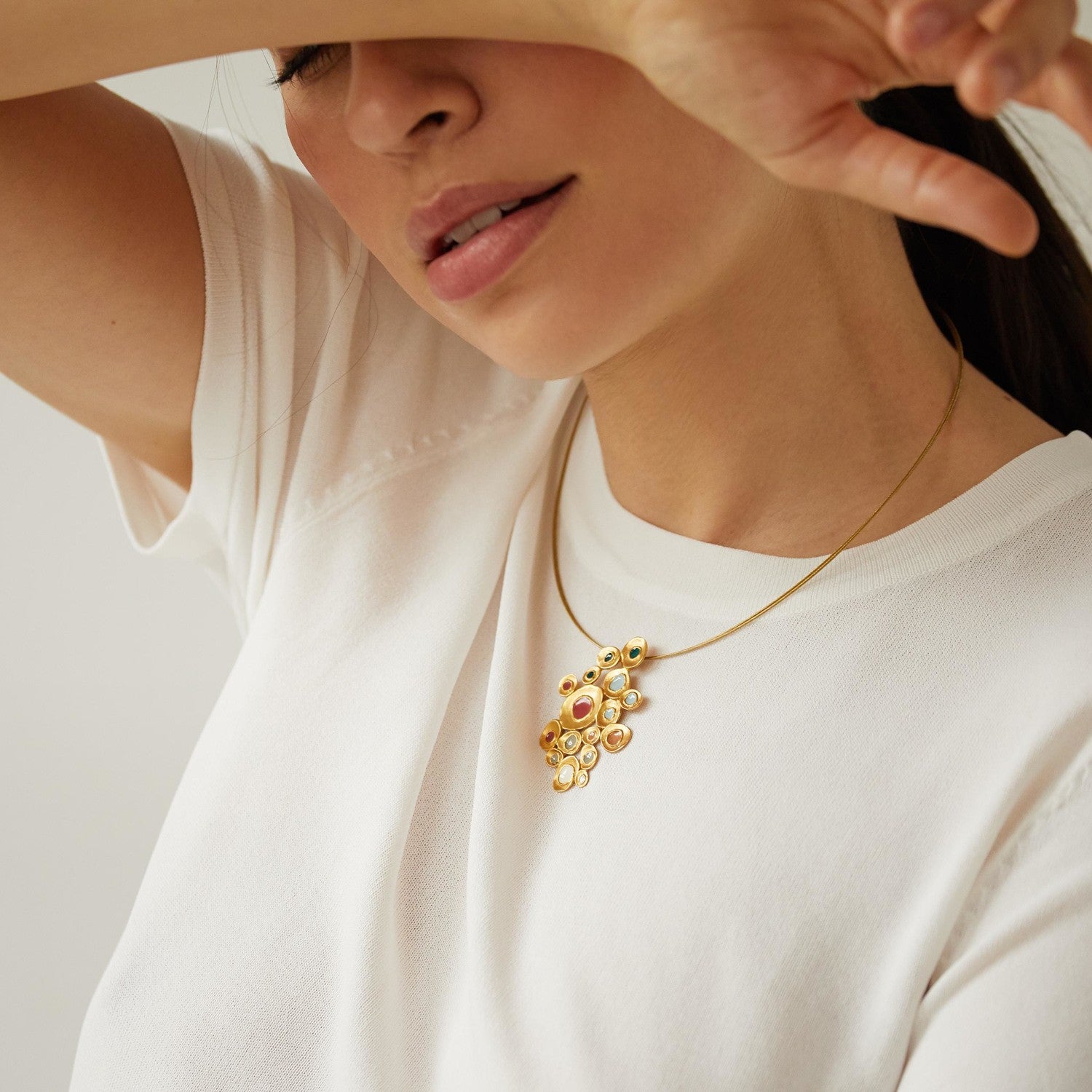 Große Halskette aus mattem Metall mit 24 Karat Vergoldung, bestehend aus vielen unregelmäßigen Formen, mit mehrfarbigem Kaltemaille und Stahldraht-Ausschnitt.