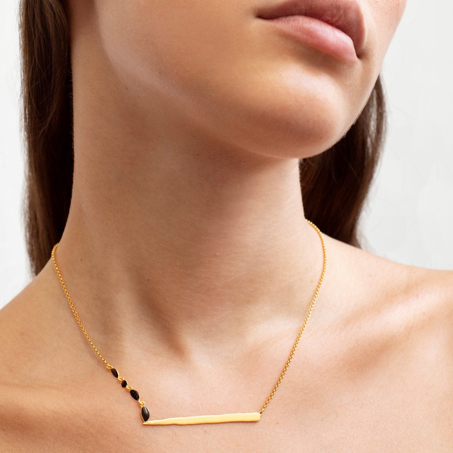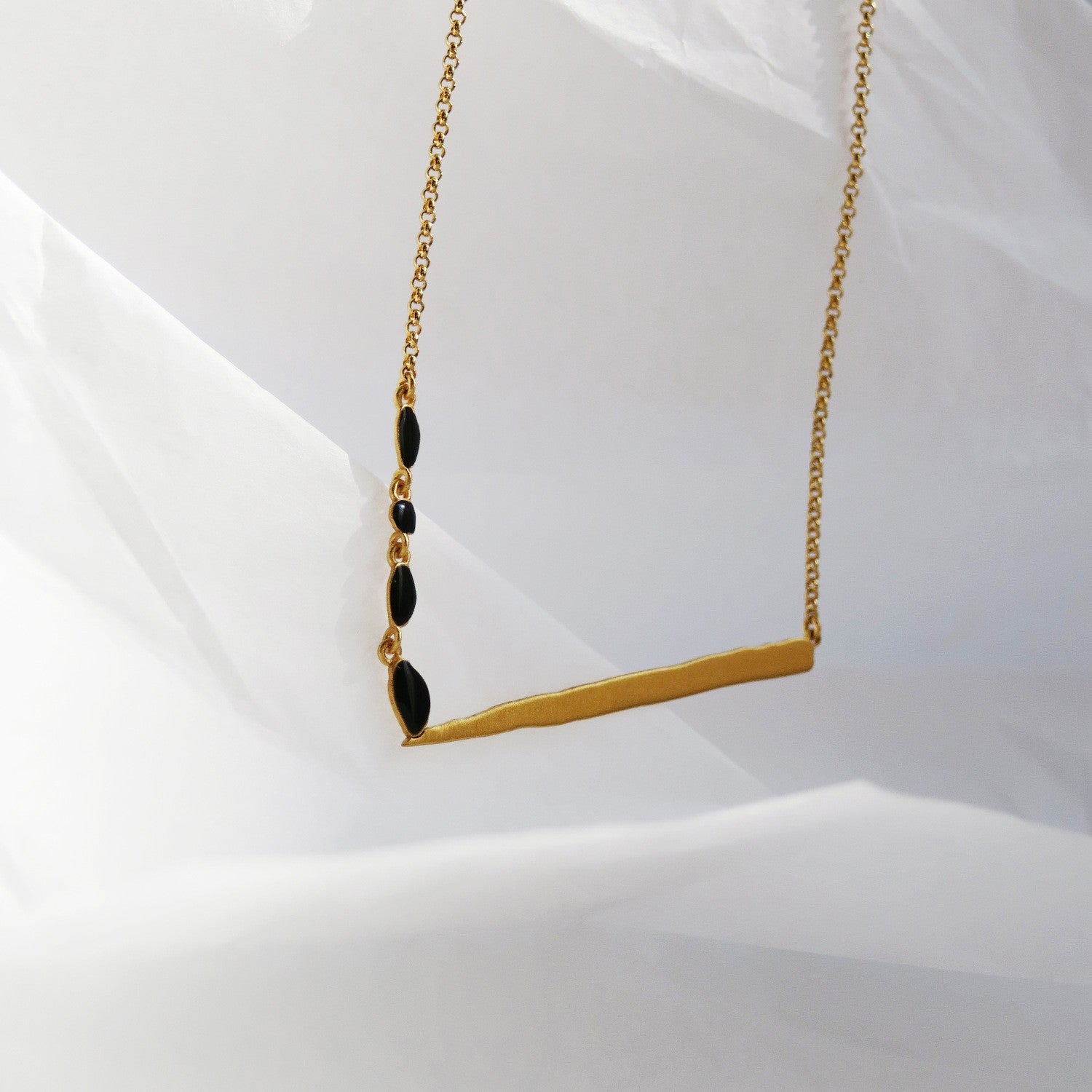 Goldene Halskette mit schwarzen Akzenten inspiriert von Joan Mirós Werk „Blue I-III” aus dem Jahr 1961.