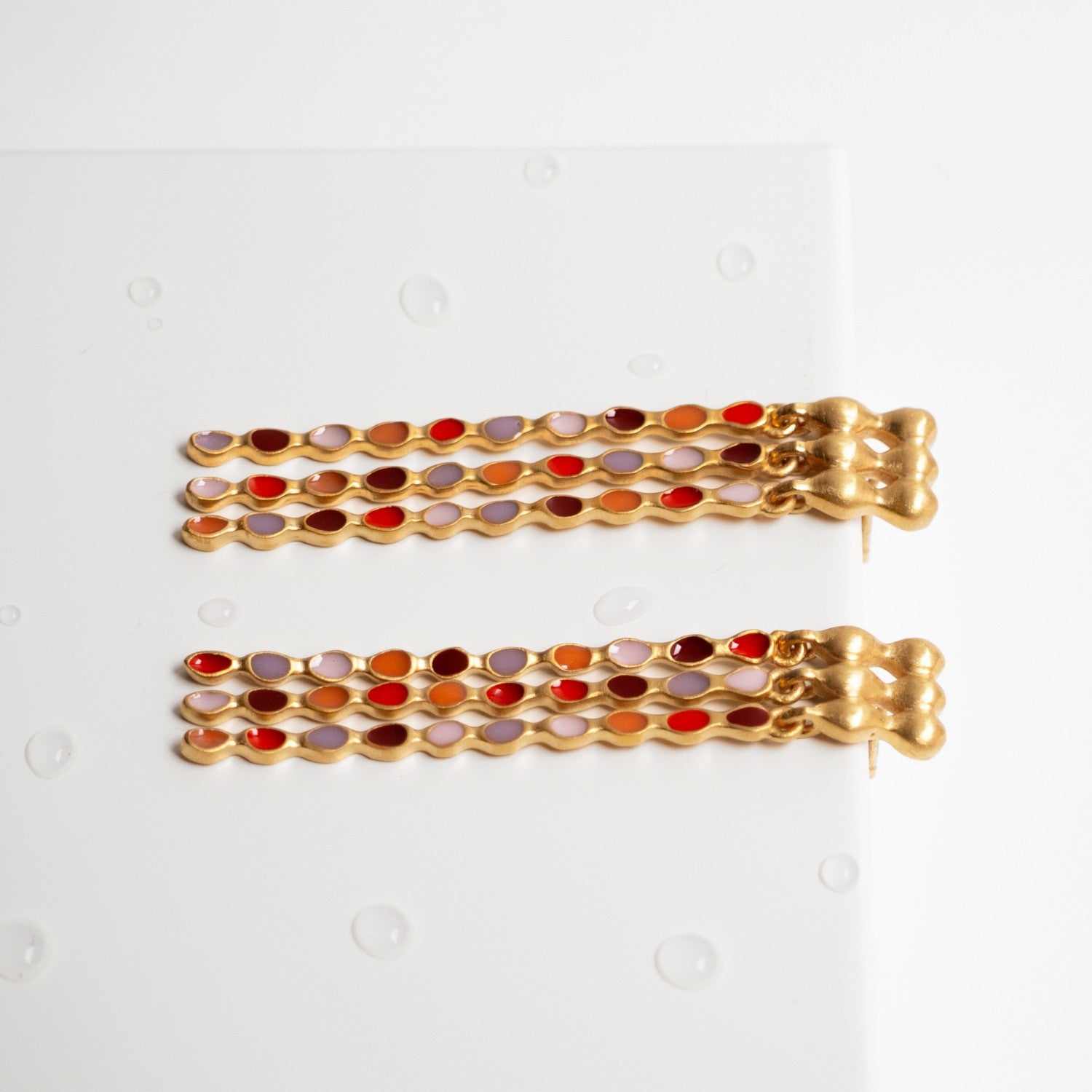 Inspiriert vom Morgentau: Lange, hängende Ohrringe aus 24 Karat vergoldetem Messing mit kühlem, mehrfarbigem Emaille.