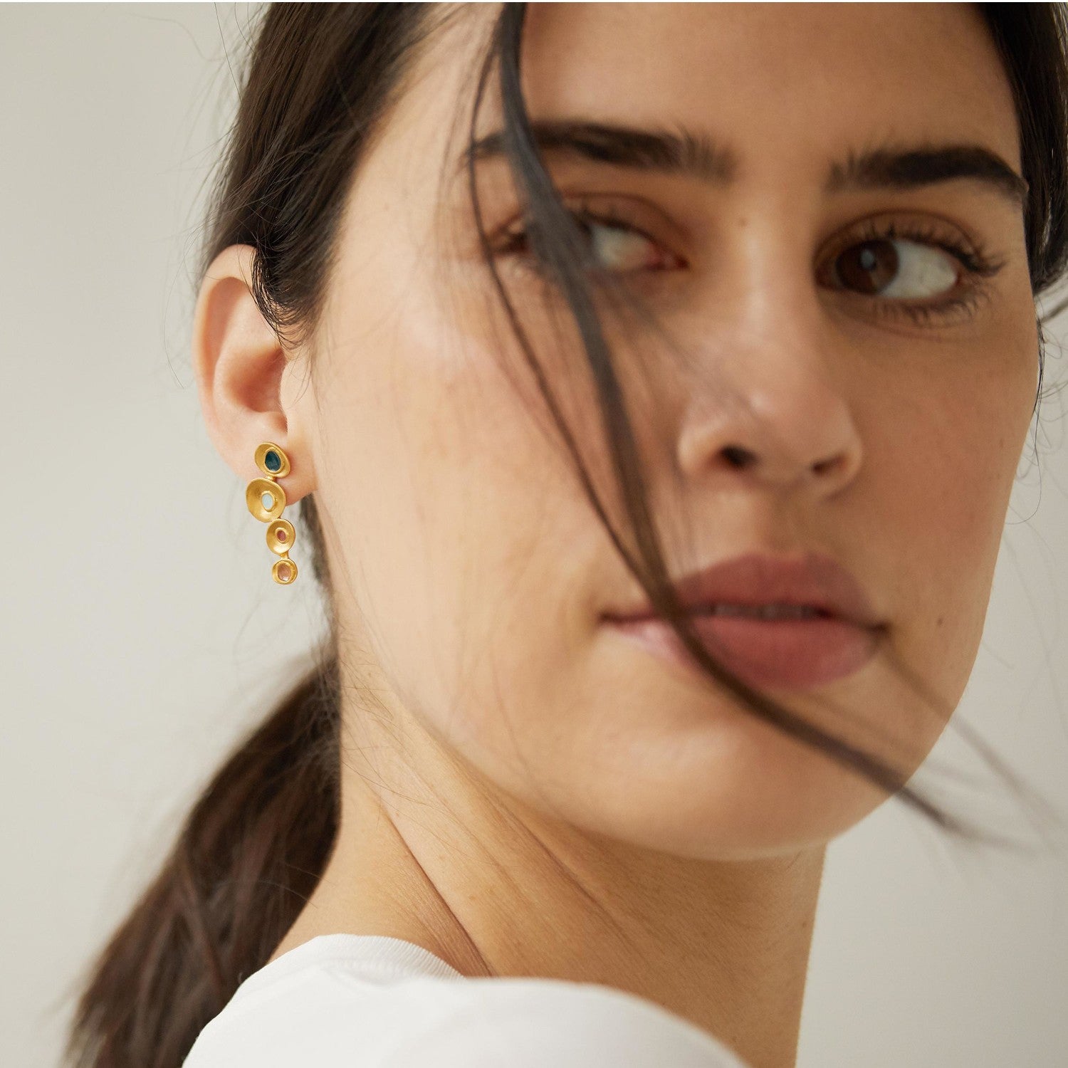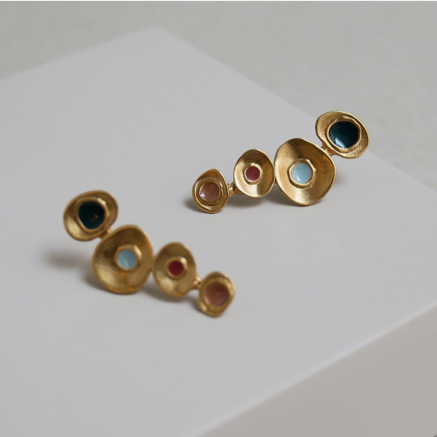 24 Karat vergoldete, matte Metall-Ohrstecker mittlerer Größe, bestehend aus vielen unregelmäßigen Formen mit mehrfarbigem Kaltemaille.