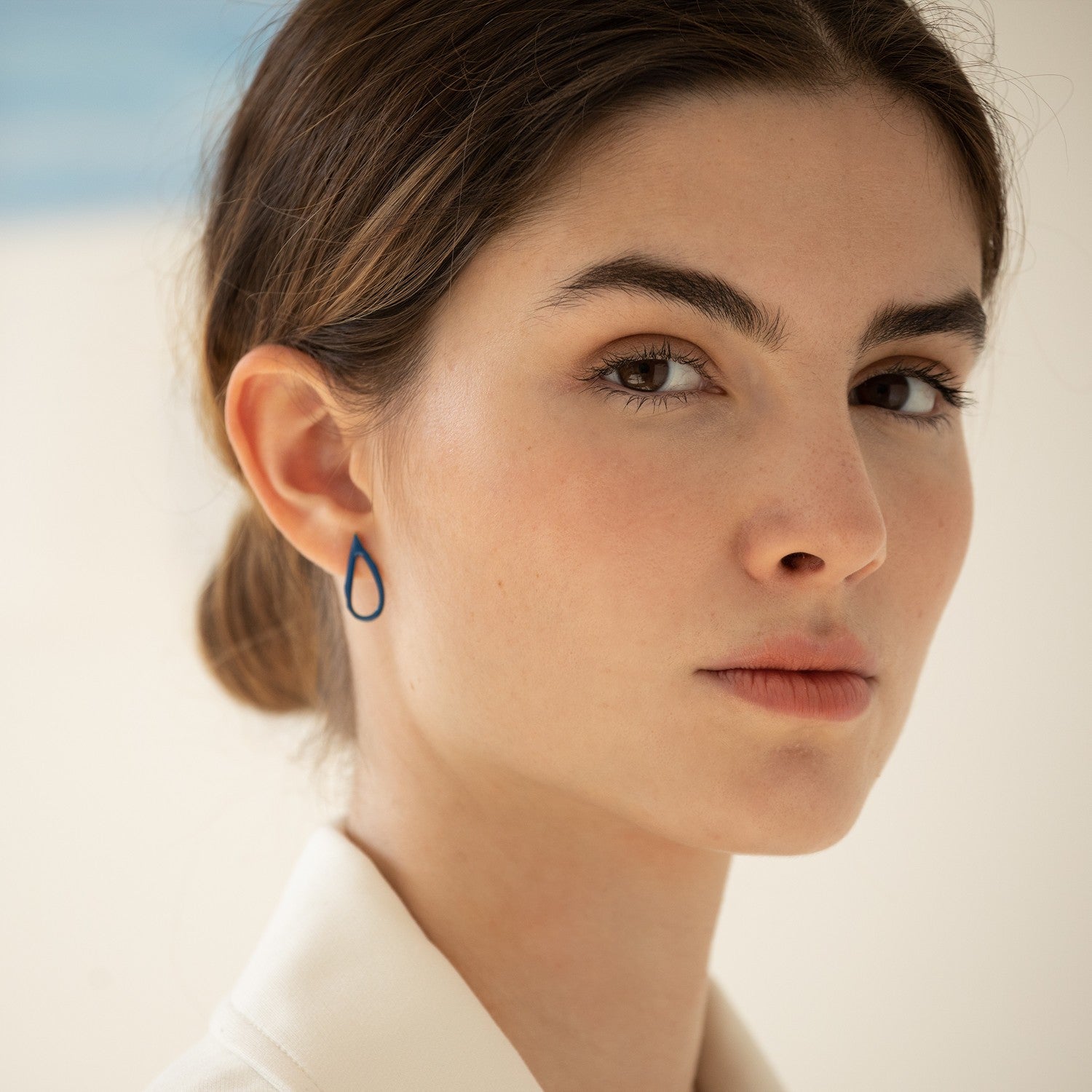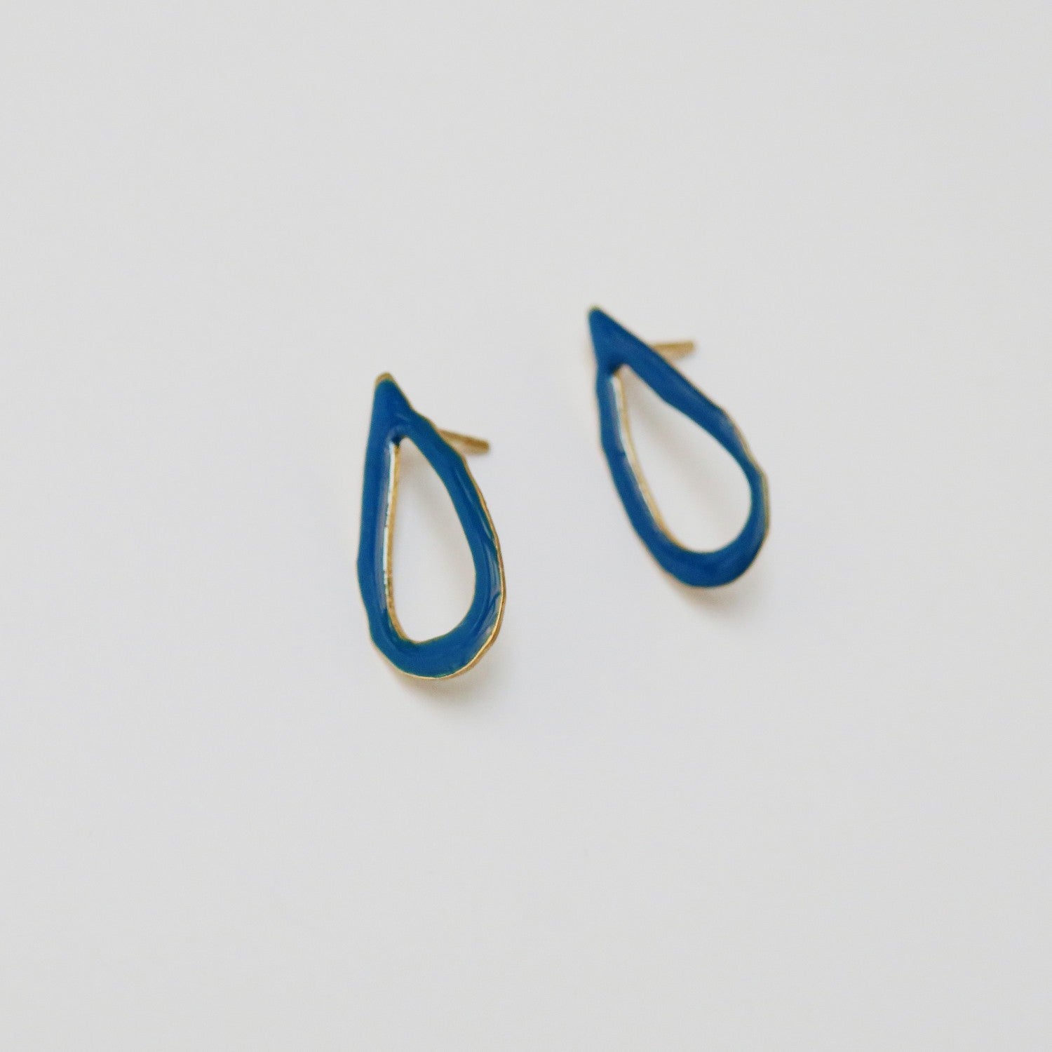 Hergestellt aus 24 Karat vergoldetem, mattem Metall in Tropfenform mit blauer Kaltemaille. Schmetterlingsverschlüsse.