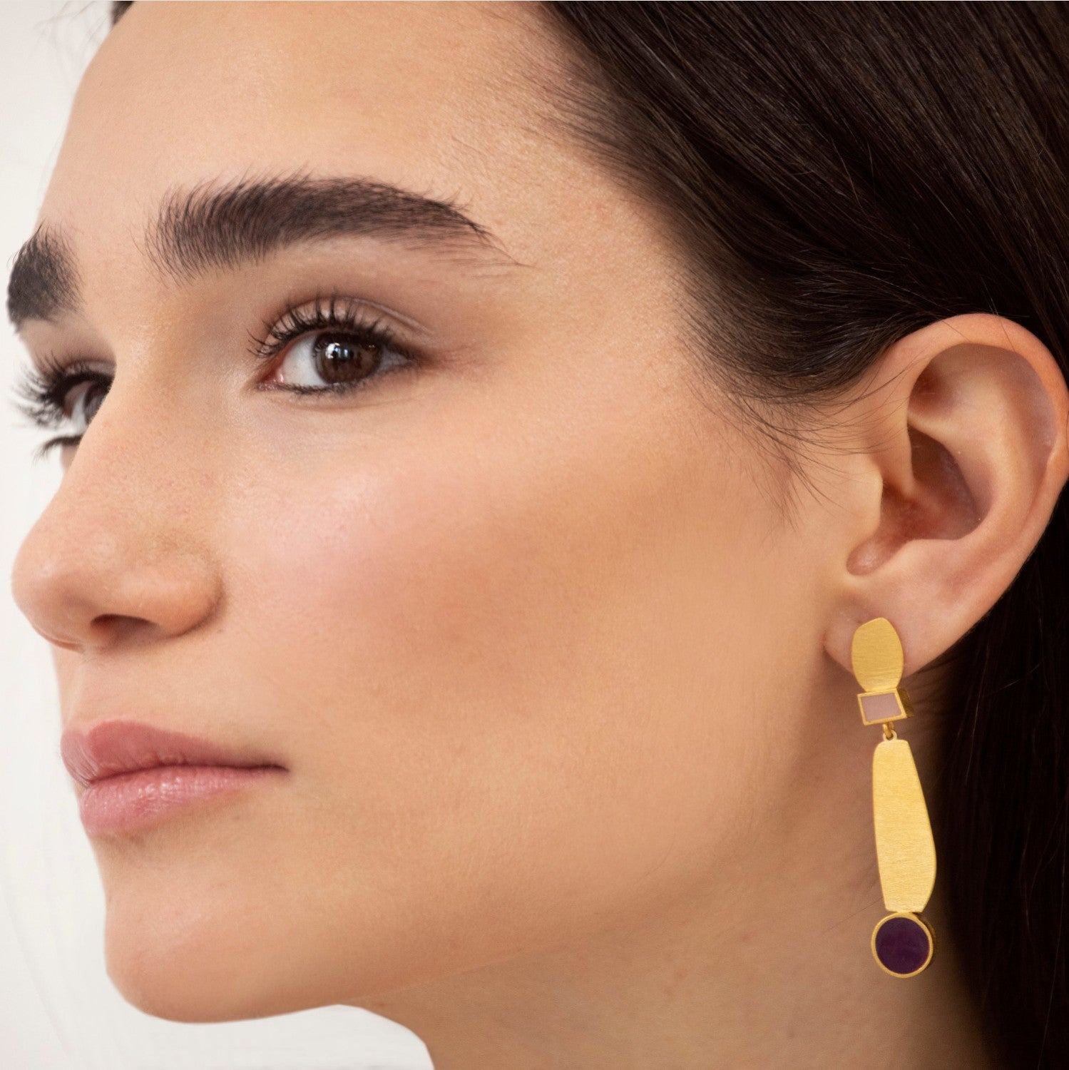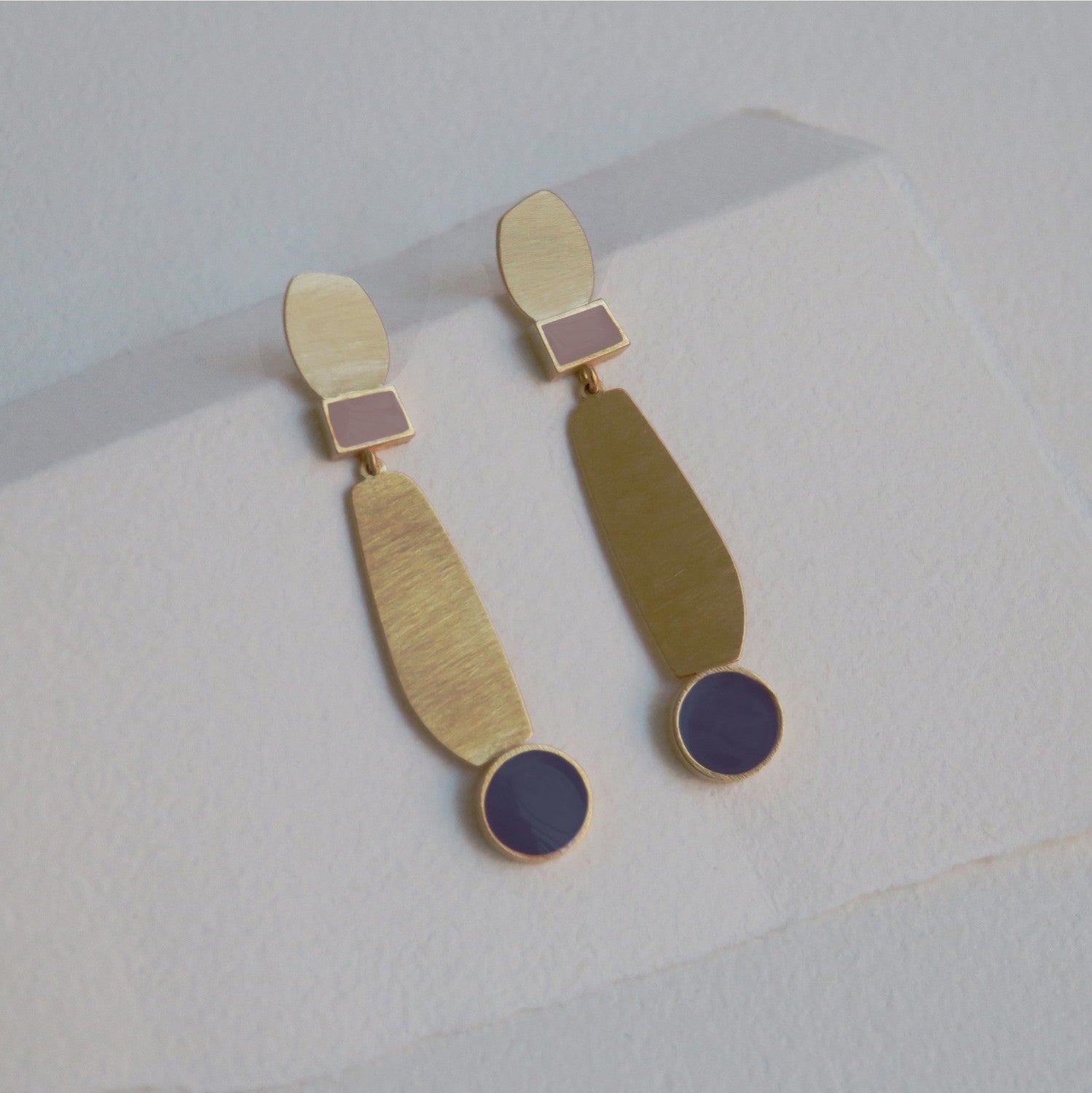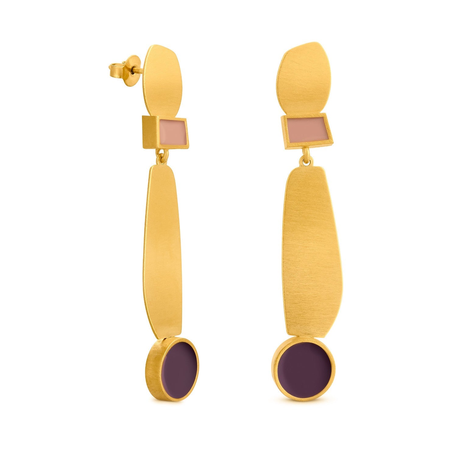 Lange Ohrringe mit vier unvollkommenen geometrischen Formen. Das Schmuckstück besteht aus mattem Messing mit 24-karätiger Vergoldung und Emaille. Schmetterlingsverschluss.