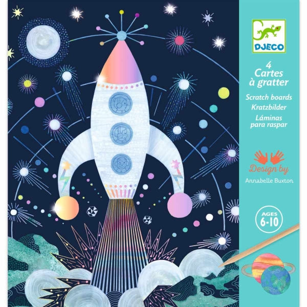 Ein Set mit 4 Kratzbildern mit irisierendem Effekt zum Thema Weltraum. Das Kind bildet die vom Künstler erdachten Motive nach. Hierzu kratzt es die Oberfläche mit Hilfe eines Holzstifts. Die Bilder werden für Schritt für Schritt, wie von Zauberhand, freigelegt!