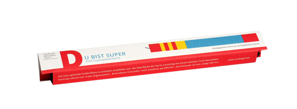 Die mehrfarbige Kerze ist aus durchgefärbtem Wachs, bei der Fertigung wird Farbschicht für Farbschicht von Hand gegossen. Die Verpackungen werden in Hamburg klimaneutral auf FSC zertifiziertem, offenen Designpapier gedruckt und weiterverarbeitet.